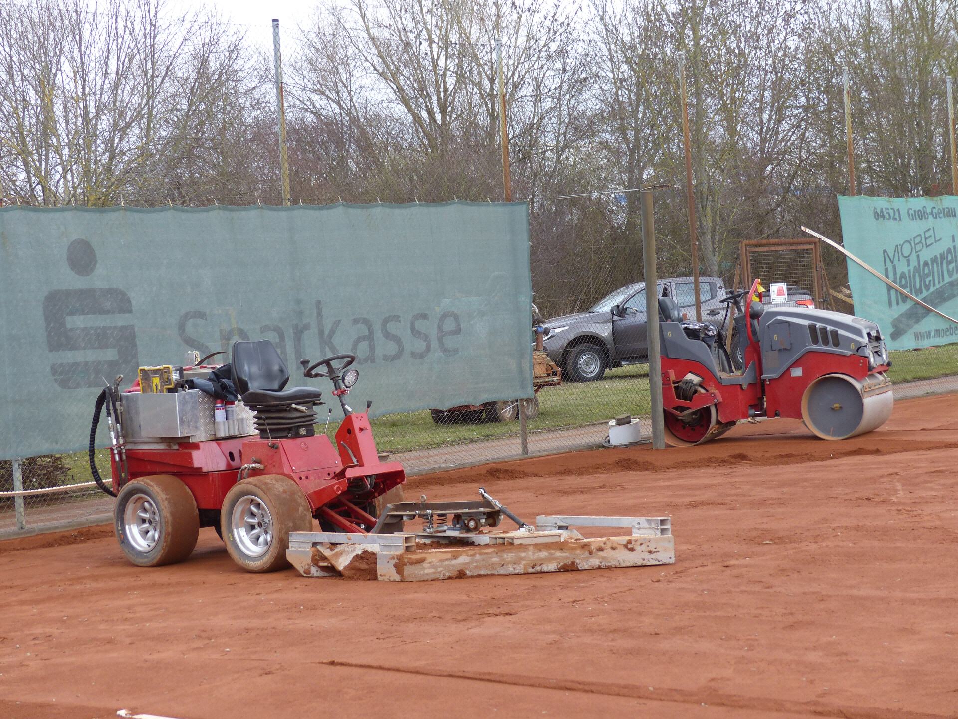 Es war eine ereignisreiche Woche, erst die Vandalen, die auf dem Gelände viel Schaden angerichtet haben, dann mit Verzögerung die Frühjahrs-Instandsetzung durch die Firma Nohe, und zuletzt haben unsere Platzwarte noch die Bäume am Zaun abgeschnitten. Wir hoffen, dass dadurch die Feuchtigkeit auf den Plätzen 1-3 die Plätze besser abtrocknet und außerdem waren mehr als die Hälfte der Bäume schon abgestorben.